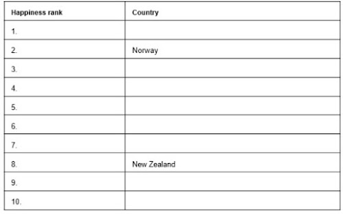 In 2018, the United Nations published a list of the world’s happiest countries. To help them make this list, they looked at the results from many different surveys. Put the countries in what you think is the correct order.